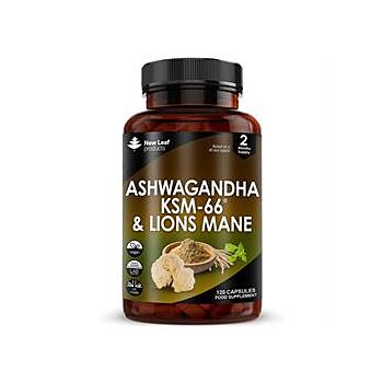 POTENT SYNERGY FOR ENHANCED WELL-BEING New Leaf's Ashwagandha KSM-66 & Lions Mane Capsules combine the power of Ashwagandha KSM-66 and Lion's Mane mushroom to support your overall well-being. Ashwagandha KSM-66 is a highly concentrated extract from the roots of the Ashwagandha plant, known for its adaptogenic properties. Lion's Mane, a unique mushroom, is prized for its potential to support cognitive function. Together, these ingredients work synergistically to enhance both mental and physical health. ENHANCED ABSORPTION WITH BLACK PEPPER Each serving of these capsules is enriched with Black Pepper extract, which is known to enhance the bioavailability of nutrients. Black Pepper contains piperine, a compound that improves the absorption of Ashwagandha KSM-66 and Lion's Mane, ensuring that your body can effectively utilize these potent ingredients. This combination maximizes the benefits, making the most out of every capsule and supporting your well-being more efficiently. SUPERIOR QUALITY AND CONVENIENCE New Leaf's Ashwagandha KSM-66 & Lions Mane Capsules provide 2000mg per serving, offering a robust dosage for maximum effect. With 120 capsules per bottle, this two-month supply ensures consistent support for your health goals. KSM-66 is the highest concentration full-spectrum extract of Ashwagandha, known for its superior quality and effectiveness. Crafted with care and enriched with natural ingredients, these capsules are designed to support your journey to enhanced health and wellness. SAFETY INFORMATION Do not exceed stated dose. If you are pregnant, breastfeeding, taking prescription medication or under medical supervision it is advisable to consult a GP prior to taking any supplements. This product is not intended to treat, cure or prevent any disease. Discontinue use and consult a GP if adverse reactions occur. Not suitable for persons under the age of 18. Keep out of reach of children at all times. Do not use if seal is broken. Food supplements should NOT be used as a substitute for a balanced diet and healthy lifestyle. INGREDIENTS Brown Rice Flour, Capsule Shell (Hydroxypropyl Methylcellulose), KSM-66 Organic Ashwagandha Root 12:1 Extract (5% Withanolides), Lions Mane 15:1 Extract (50% Polysaccharides), Black Pepper 10:1 Extract DIRECTIONS Take two capsules per day with a full glass of water. Do not exceed stated dosage.