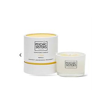 Psychic Sisters luxury citrine gemstone candle, with the relaxing scent of Neroli with two pieces of natural citrine that have been Reiki cleansed & charged.